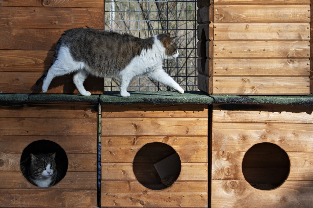 Esternamente al nuovo gattile si aggiungono sul piazzale del Rifugio, un locale con otto piccoli box per l’accoglienza dei gatti in via temporanea, un ospedalino per le gatte con cuccioli e due piccole baite da 10mq ciascuna, utilizzate in estate per far fronte alle emergenze legate all’arrivo di cucciolate.