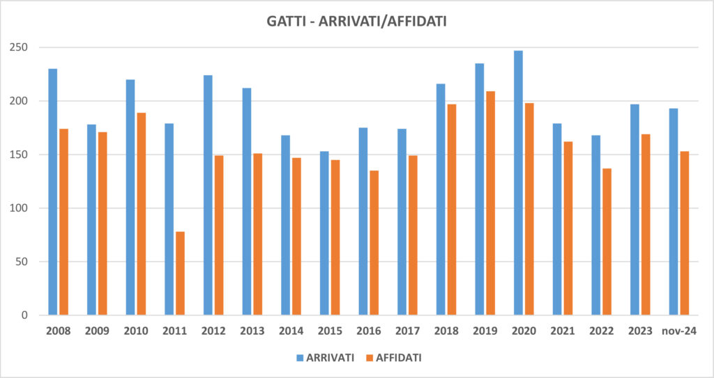 Nei primi 11 mesi del 2024 sono arrivati al Rifugio 193 gatti, una cifra che a fine anno forse supererà le 200 unità risultando superiore a quella del 2023. Attualmente sono presenti al gattile 80 gatti, cifra che si mantiene costante negli anni. Gran parte dei gatti arrivati sono cuccioli, dato piuttosto preoccupante, a significare che il randagismo felino è veramente difficile da contenere, nonostante gli sforzi messi in campo. Fortunatamente le adozioni rimangono elevate: a fine novembre erano 153 i gatti affidati, di cui 25 adulti e 128 piccolini, cosa che denota il grande impegno profuso dagli operatori del Rifugio e dal team dei volontari per trovare famiglie adatte ad ognuno di loro, con appelli sui social, sulla stampa e con un costante e motivato lavoro.