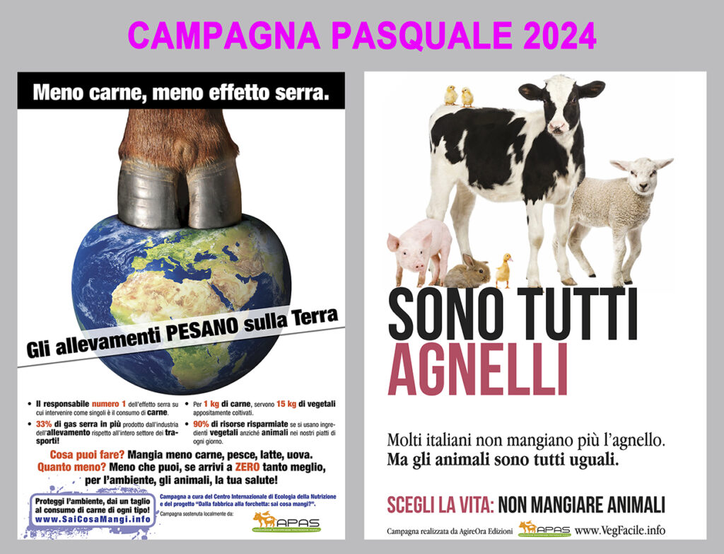 Non solo agnelli, ma anche polli, vitelli, maiali e altri animali, esseri intelligenti e sensibili vengono uccisi a milioni ogni anno, soprattutto nelle ricorrenze religiose nei mattatoi di tutto il mondo per soddisfare il palato umano. Occorre dire basta a questa crudeltà, scegliendo di non alimentarsi con cibi animali, l’alimentazione a base vegetale, può essere molto gustosa, è sana, salutare e soprattutto rispetta il Pianeta.
